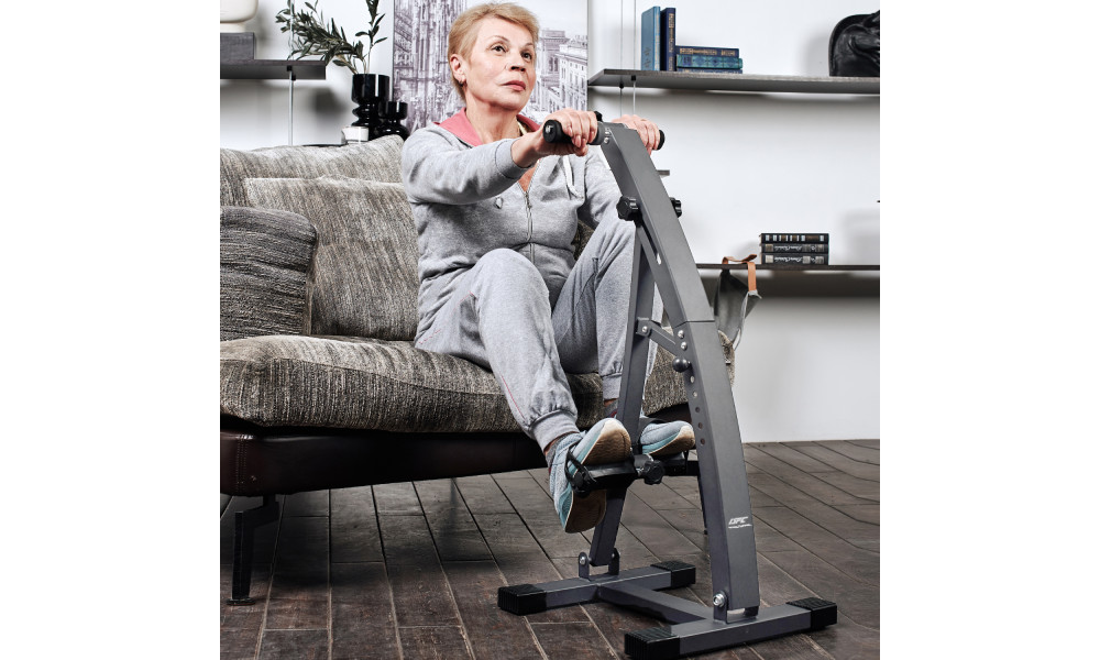 Педальный велотренажер dual bike для рук и ног серого цвета. Уникальная конструкция разработана специально для реабилитации, и в дальнейшем адаптирована для людей с различной физической подготовкой. Рекомендуется для занятий пожилым людям, и в качестве реабилитационного оборудования. Занятия на тренажере помогают улучшить кровообращение и координацию движения, сжигается жир, мышцы приводятся в тонус. Стойка велотренажера с регулировкой позволяет установить оптимальную высоту верхних педалей для удобства занятий людям разной комплекции. Педали для ног оборудованы резиновыми ремешками. Занятия на тренажеры выполняются сидя на стуле, кресле и любимом диване. Необходимую нагрузку (сопротивление) педалей можно отрегулировать отдельно для рук и для ног с помощью удобной пластиковой ручки. На тренажере установлен компьютер, отображающий всю необходимую во время тренировки информацию: время, расстояние, сканирование, количество оборотов, общее количество оборотов, калории. Тренажер в основании имеет 4 резиновые ножки, что позволяет полностью исключить его смещение на полу во время занятий.